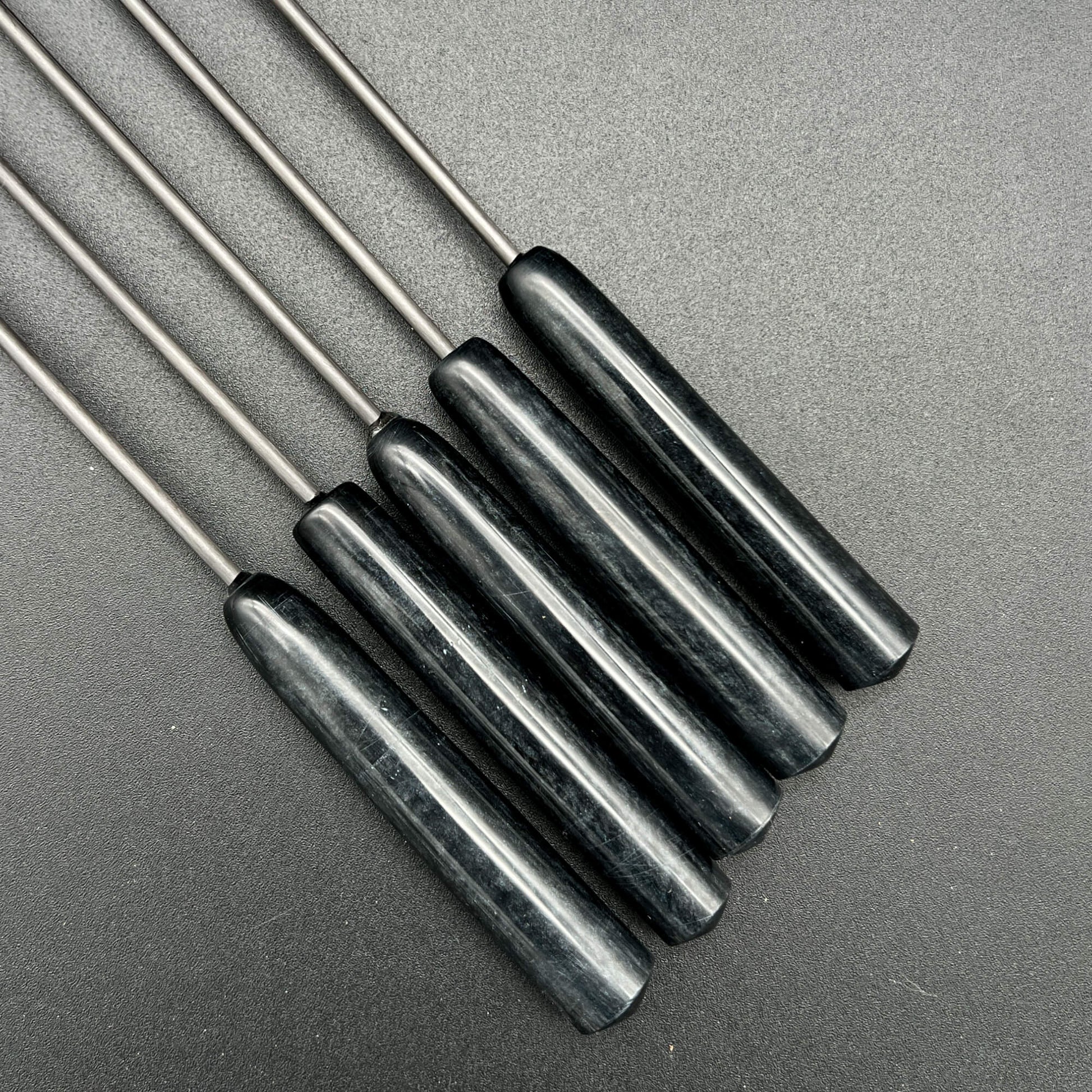 Each diabolical stick has a hand-turned, hand-poured resin handle and an eight-stud building brick made of resin at the other end. In between is a 3mm carbon fiber rod. It's a stiff rod that doesn't bend much, but you only need to pull back the brick just a little bit for maximum pain and pleasure.