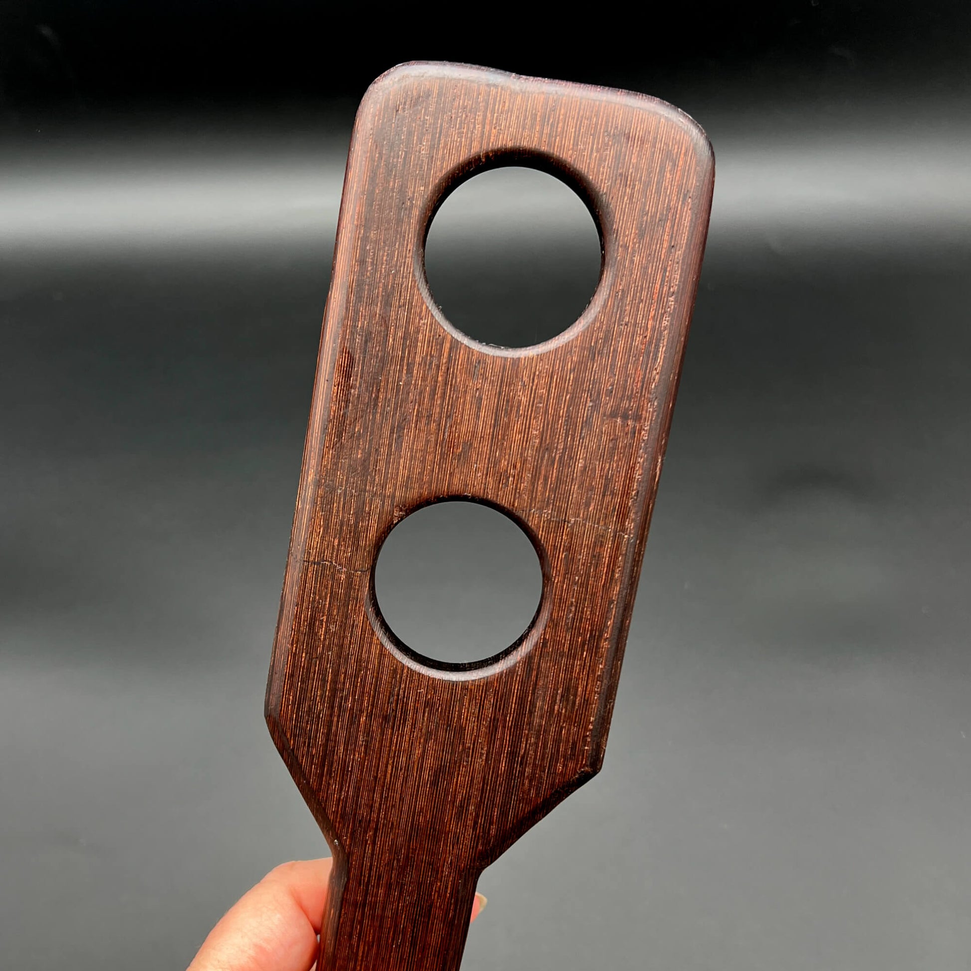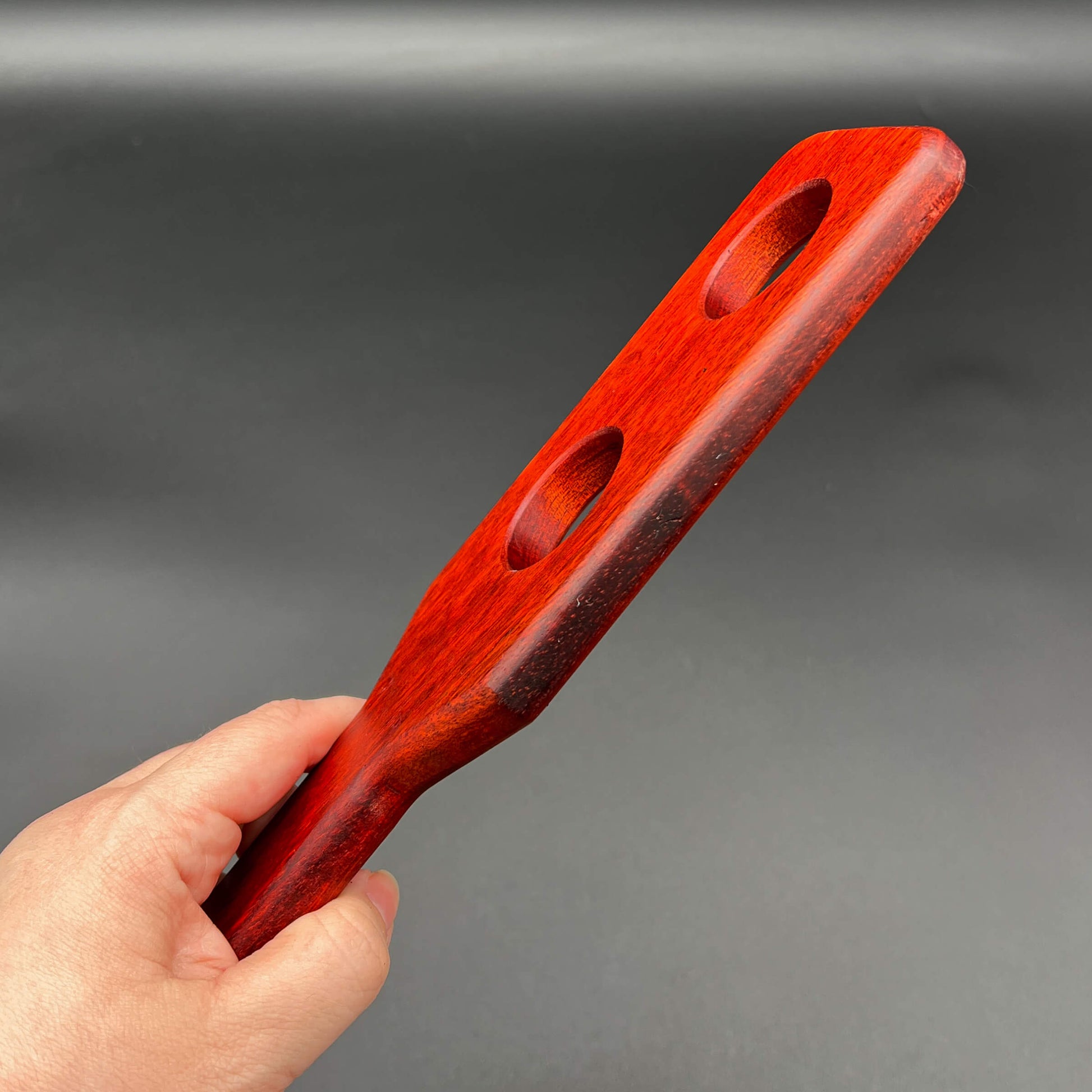 The unique weight of the wood used (different for each paddle) and shape may offer a thudding sensation. The holes bring the stinging pain. Both leave quite an impression on the mind and the ass.