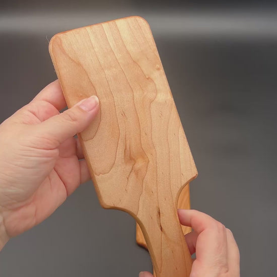 The spanking area of the paddle covers a lot of room with 6 inches in length and 3 1/2 inches wide. Made from a variety of woods, the Oversized Hairbrush paddle has a nice solid feel in your hand and is comfortable to hold.