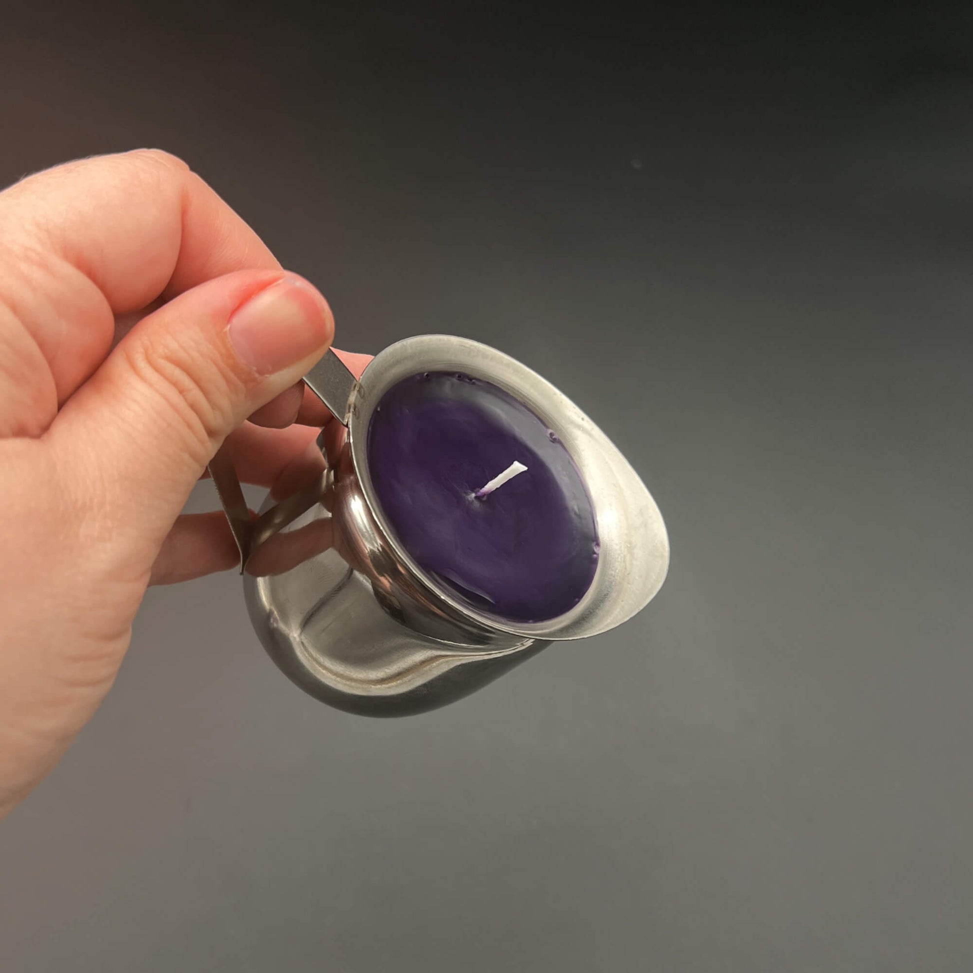 Our paraffin candles are made of 100 percent paraffin, hand-poured, and dyed with purple liquid candle dye. The color may look almost black in the container but it dries a deep purple on the skin.