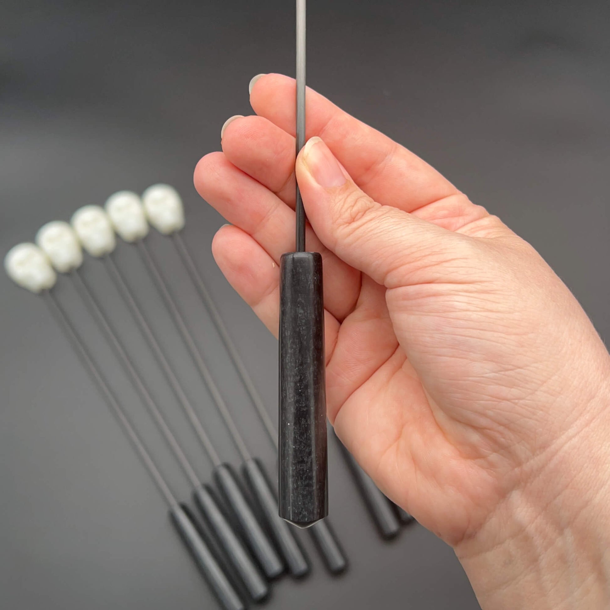 Each diabolical stick has a hand-turned, hand-poured resin handle and a skull made of resin at the other end. In between is a 3mm carbon fiber rod. It's a stiff rod that doesn't bend much, but you only need to pull back the brick just a little bit for maximum pain and pleasure.